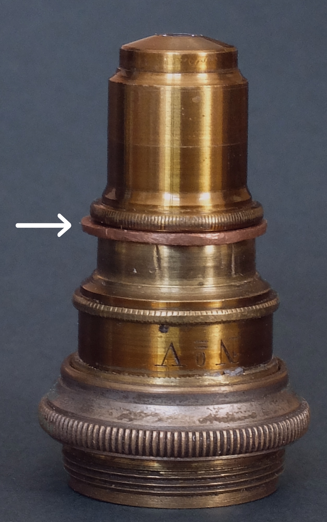 Est-ce François Billen ou un possible précédent propriétaire du Seibert N° V qui a inséré une bague d’épaisseur, manifestement de fabrication artisanale, entre la monture de l’objectif et le bloc optique (fig.10) ? Un si petit allongement du tube (1,1 mm) ne modifie pas la qualité de l’image et seulement d’une façon imperceptible le grossissement. Sa raison d’être fut plus que probablement de rendre l’objectif parafocal avec un autre… En saura-t-on jamais davantage ?